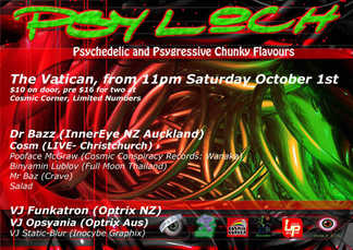 - DJs: Dr Bazz (InnerEye NZ), COSM (LIVE-ChCh), Pooface McGraw (Cosmic conspiracy records), Binyamin lublow (full moon thailand), Mr Baz (crave), 'Salad'