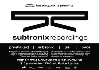 DJs: Presha (Akl), Trei, Subsonik, Pace (Wgtn)